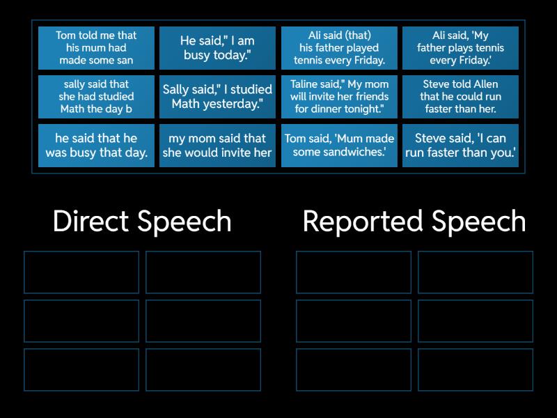 Direct Speech: Ali said, 'My father plays tennis every Friday.', Tom said, 'Mum made some sandwiches.', Steve said, 'I can run faster than you.', He said," I am busy today.", Sally said," I studied Math yesterday.", Taline said," My mom will invite her friends for dinner tonight.", Reported Speech: Ali said (that) his father played tennis every Friday., Tom told me that his mum had made some san, Steve told Allen that he could run faster than her., he said that he was busy that day., sally said that she had studied Math the day b, my mom said that she would invite her,