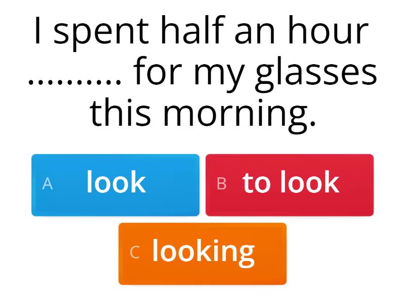 1) The results appear .......... the scientist's theory. a) support b) to support c) supporting 2) I'm hoping .......... my own company if I get a bank loan. a) to set up b) setting up c) both 3) It isn't worth .......... to the exhibition. It's really boring. a) go b) to go c) going 4) Sue makes her two teenagers .......... the washing-up every evening. a) do b) to do c) doing 5) We're planning .......... a big party to celebrate. a) have b) to have c) having 6) Can you .......... me carry these suitcases? a) help b) to help c) both 7) I regret not .......... more before I got my first job. a) travel b) to travel c) travelling 8) I always try to avoid .......... in the rush hour. a) drive b) to drive c) driving 9) I must .......... to phone Henry - it's his birthday today. a) remember b) to remember c) remembering 10) I can't afford .......... on holiday this summer. a) go b) to go c) going 11) I used to enjoy .........., but now I don't. a) fly b) flying c) both 12) You'd better .......... now if you want to catch that train. a) leave b) to leave c) leaving 13) Let me .......... for the coffee - it must be my turn. a) pay b) to pay c) paying 14) Does your father miss .......... now that he has retired? a) to work b) working c) both 15) Once I open a box of chocolates, I can't stop .......... them. a) eat b) to eat c) eating 16) A friend of mine suggested .......... London in the autumn. a) visit b) to visit c) visiting 17) Sarah always promises .......... me in the kitchen, but she never does. a) help b) to help c) helping 18) Kim deserves .......... the job. She's a very strong candidate. a) get b) to get c) getting 19) We are really looking forward to ..........you again. a) see b) to see c) seeing 20) If I were you, I woudn't risk .......... through the park at night. a) walk b) to walk c) walking 21) The teacher threatened ......... my parents and tell them what I had done. a) call b) to call c) calling 22) When I was a child at school we were made .......... a uniform. It was awful. a) wear b) to wear c) wearing 23) Do you fancy .......... a film this evening? a) see b) to see c) seing 24) I spent half an hour .......... for my glasses this morning. a) look b) to look c) looking 25) You look tired. Would you rather .......... in this evening and watch a film? a) stay b) to stay c) staying