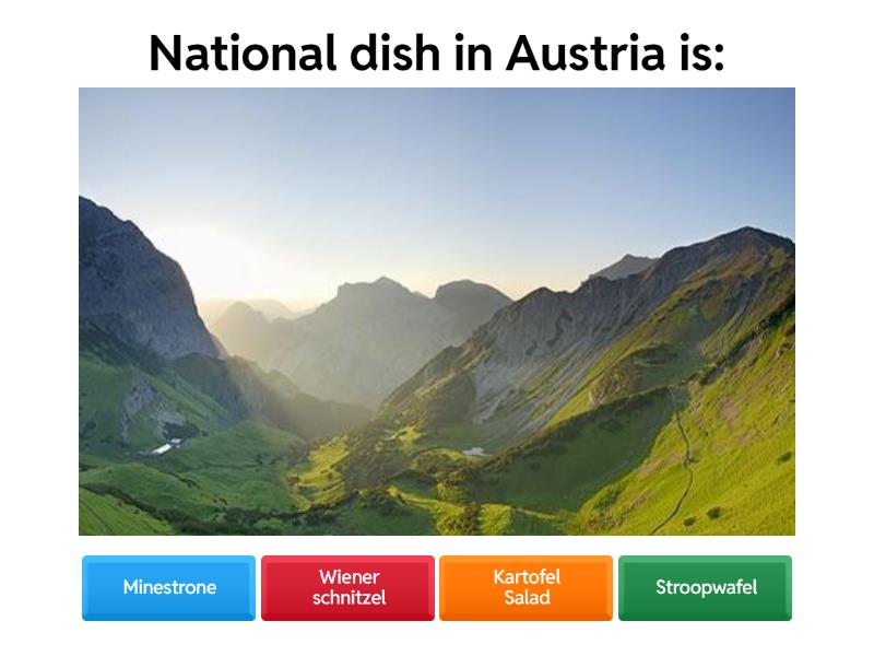 1) National dish in Austria is: a) Minestrone b) Wiener schnitzel c) Kartofel Salad d) Stroopwafel 2) Bulgarians shake their head for 'yes' and nod for 'no'. a) TRUE b) FALSE 3) National flower of Croatia is: a) tulip b) rose c) iris d) lillie 4) There are over ... castles to visit in Czech Republic. a) 100 b) 200 c) 300 d) 400 5) Lahemaa National Park is in the ... of Estonia. a) South b) East c) West d) North 6) Lapland in Finland is famous of it's cheese and: a) Santa Claus Village b) Karlstejn Castle c) Big Ben d) Eiffel Tower 7) In France you can eat: a) salmiak, tomato soup and dumplings b) cheese, tomatoes and spaghetti c) fish and chips d) frogs, snails and baguettes 8) Parthenon, a former temple dedicated to the goddess Athena is in: a) Slovakia b) Italy c) Greece d) Georgia 9) Mtskheta is ... a) the Georgian national dish b) the first capital city of Georgia c) a mountain in the South of Georgia d) the longest river in Georgia. 10) Spanish festival that is held in the Valencian town of Buñol, in which participants throw tomatoes for entertainment purposes is called: a) La Tomatina b) Tomatini Palma c) Tomatosa d) La Tomatola 11) What musical instrument is the symbol of Ireland? a) flute b) drum c) violin d) harp 12) The beings that are very similar to people but just a little bit taller, thinner, and more beautiful, that live in Iceland are called: a) ghosts b) elves c) glaciers d) dwarfs 13) A national dish of Lithuania, dumplings made from grated and riced potatoes and stuffed with ground meat or dry curd cheese or mushrooms are called: a) Bulvës b) Cepelinai c) Kugelis d) Grybais 14) The capital city of the Netherlands, Amsterdam, is located below sea level. a) TRUE b) False 15) The largest folk festival in the world - Oktoberfest - starts in ... a) August b) September c) October d) December 16) All people in Norway know, that Sognefjorden is ... a) the name of the King of Norway. b) the deepest fjord in the world. c) the longest highway in Norway. d) the Norwegian national dish. 17) The longest bridge in Europe is in Portugal. Where is it exactly? a) In Lisbone. b) In Porto. c) In Madrid. d) In Viana do Castello. 18) Which of these languages is not the official language in Switzerland? a) German b) French c) Dutch d) Romansh 19) That city in Sweden is famous for its art in metro stations. a) Gothenburg b) Stockholm c) Malmö d) Landskrona 20) Hungary shares its borders with: a) Austria, Bulgaria, Serbia, Czech Republik and Belgium. b) Ukraine, Slovenia, Croatia, Germany and France. c) Austria, Croatia, Romania, Serbia, Slovakia, Slovenia and Ukraine d) Ireland, Norway, Russia, Austria, Ukraine, France and Spain. 21) Which sentence about The United Kingdom of Great Britain and Northern Ireland is correct? a) The island of Great Britain includes Scotland, Wales and Northern Ireland. b) England is in the North of Great Britain. c) Wales is an island. d) The UK consists of four countries. 22) Italy is shaped like a ... a) moon. b) cucumber. c) boot. d) tie.