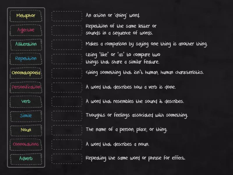 Simile - Using ‘like’ or ‘as’ to compare two things that share a similar feature., Metaphor - Makes a comparison by saying one thing is another thing., Personification - Giving something that isn’t human, human characteristics., Alliteration - Repetition of the same letter or sounds in a sequence of words., Repetition - Repeating the same word or phrase for effect., Onomatopoeia  - A word that resembles the sound it describes., Noun - The name of a person, place, or thing., Verb - An action or 'doing' word., Adjective - A word that describes a noun., Adverb - A word that describes how a verb is done., Connotations - Thoughts or feelings associated with something.,