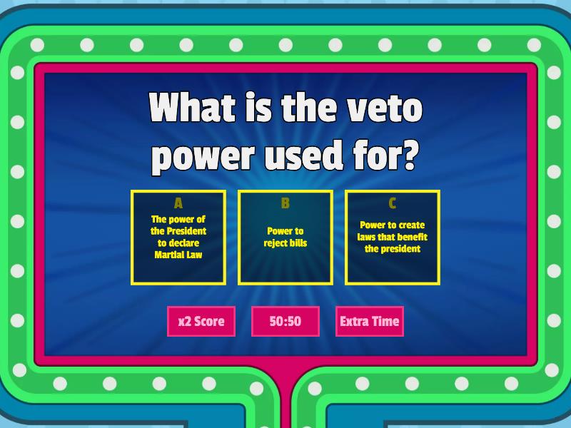 1) What is the veto power used for? a) The power of the President to declare Martial Law b) Power to reject bills c) Power to create laws that benefit the president 2) What is a presidential Pardon? a) It allows the president to excuse or forgive someone from prison b) The power to declare war c) It allows the president to create laws that cannot be check by any other branch of government 3) Who can the president send to Congress to break a tie-vote? a) The First Lady b) Interests Groups c) The Vice President 4) What is an executive order? a) A presidential order that acts as a law b) A presidential order that allows the president to remove people from office. c) The power to veto bills 5) The power to declare laws unconstitutional belongs to which branch of government? a) Article I b) Article II c) Article III 6) What is Judicial Review? a) The power to reject bills b) The power to review the law and declare unconstitutional c) The power to appoint senators 7) How can the Executive Branch check the power of the Congress? a) By declaring war b) By vetoing bills c) By appointing new members of Congress 8) How can the Judicial Branch check the power of the President? a) By declaring executive orders unconstitutional  b) By declaring bills unconstitutional  c) By declaring war declarations unconstitutional  9) How can the Legislative Branch check the power of the President? a) By levying taxes of the president b) By raising an army against the president c) By overriding vetoes 10) Why was the idea of “separation of powers” developed? a) To create a system of checks and balances b) To keep the government equal c) To make one section of the government more powerful than the others d) To give the President three different powers 11) Which branch of government is being described? It has the power to review the law and declare laws unconstitutional.... a) Article I (Legislative) b) Article II (Executive) c) Article III (Judicial) 12) Which branch of government is being described? It has the power to veto laws, enforce, the law, and appoint government officials. It is also commander in chief of the military... a) Article I (Legislative) b) Article II (Executive) c) Article III (Judicial) 13) Which branch of government is being described? It main power id to write the law, but it can also override vetoes, declare war, and establish post offices.... a) Article I (Legislative) b) Article II (Executive) c) Article III (Judicial)