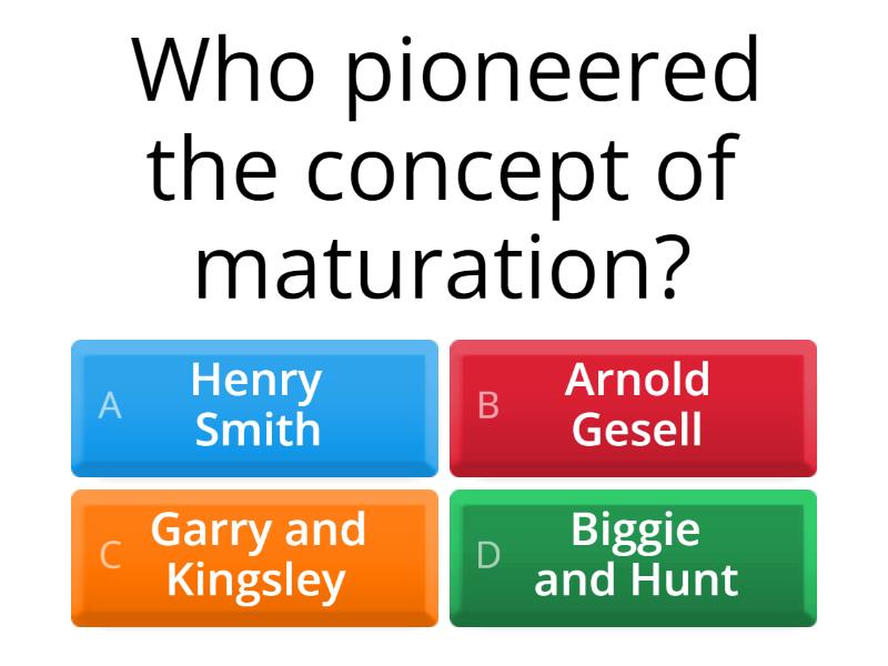 1) Who pioneered the concept of maturation? a) Henry Smith b) Arnold Gesell c) Garry and Kingsley d) Biggie and Hunt 2) The first stage of development consists wholly of? a) maturation b) physical development c) brain development d) learning 3) What does maturation depend on? a) learning b) stimulation c) growth and development d) heredity 4) One of the effects of maturation - learning interrelationship is? a) deprivation of learning opportunities limits development b) interest in learning c) improvement d) dependence on heredity 5) What is biologically predetermined? a) readiness to learn b) maturation c) learning d) social development 6) One of the criteria to determine 'readiness to learn' is? a) variation in patterns of development b) natural process c) phylogenetic development d) sustained interest 7) 'Learning is the acquisition of new behavior or strengthening or weakening of old behavior as a result of experience.' This quote is said by? a) Gates and Jersild b) Henry Smith c) Crow and Crow d) Arnold Gesell 8) Improvement can take place through? a) interest in learning b) practice and exercise c) ontogenetic development d) phylogenetic development 9) Which type of development refers to physical, cognitive, emotional and social development that can be attributed to individual's experiences with environment?  a) structural development b) phylogenetic development c) ontogenetic development d) learning 10) Which method of teaching is used for small children? a) debate b) lecture method c) play method d) instructional method