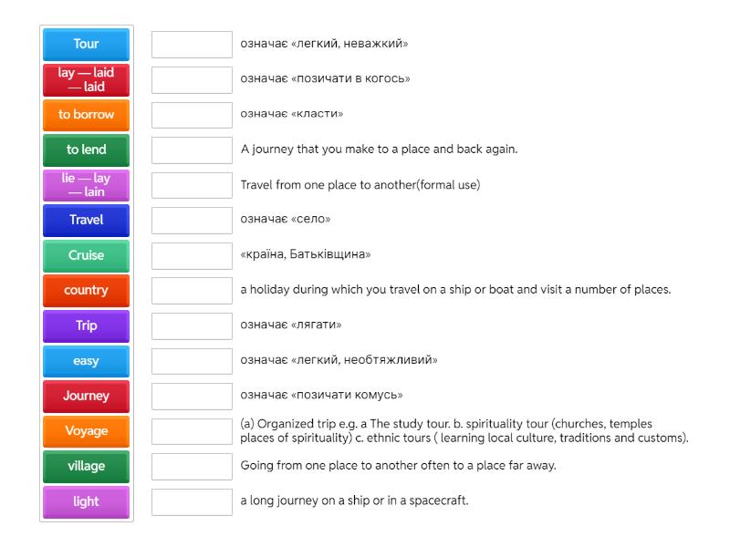 Trip  - A journey that you make to a place and back again., Travel  - Going from one place to another often to a place far away., Journey - Travel from one place to another(formal use), Tour - (a) Organized trip e.g. a The study tour. b. spirituality tour (churches, temples places of spirituality) c. ethnic tours ( learning local culture, traditions and customs)., Cruise - a holiday during which you travel on a ship or boat and visit a number of places., Voyage - a long journey on a ship or in a spacecraft., lie — lay — lain - означає «лягати», lay — laid — laid - означає «класти», to lend - означає «позичати комусь», to borrow - означає «позичати в когось», easy - означає «легкий, неважкий», light - означає «легкий, необтяжливий», village - означає «село», country - «країна, Батьківщина»,