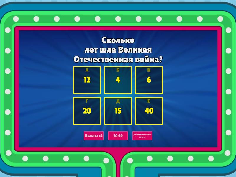 1) Сколько лет шла Великая Отечественная война? a) 12 b) 4 c) 6 d) 20 e) 15 f) 40 2) Сколько дней длилась оборона Брестской крепости? a) 20 b) 10 c) 2 d) 50 e) 30 f) 15 3) Что означают цвета георгиевской ленточки? a) дым и пламя b) солнце и луна c) свобода и радость d) жизнь и славу e) трава и небо f) ничего  4) Сколько дней продолжалась решающая битва за Сталинград? a) 500 b) 150 c) 200 d) 300 e) 115 f) 130 5) Какой город России в годы Великой Отечественной войны выдержал 900-дневную осаду немецких войск? a) Ленинград, ныне Санкт-Петербург. b) Киев c) Ростов-на-Дону d) Чита e) Москва f) Новгород 6) По льду какого озера проходила «Дорога жизни», проложенная для снабжения блокадного Ленинграда? a) Байкал b) Кенон c) Нил d) Волга e) Ладожское  f) Онежское 7) Какой из этих отечественных танков стал легендой Второй Мировой войны? a) Т-44 b) Т-54 c) Т-10 d) Т-34 e) Т-55 f) Т-62 8) Что во время Великой Отечественной Войны называли «катюшами»? a) Танк b) Убежище c) Ракетные установки d) Девушку-повара e) Девушку-врача f) Боевую собаку 9) Когда было водружено Знамя Победы над Рейхстагом в Берлине? a) 30 апреля 1945 b) 12 апреля 1945 c) 30 августа 1953 d) 10 мая 1945 e) 1 июня 1946 f) 4 марта 1945 10) Какое название получил парад, прошедший на Красной площади 24 июня 1945 года? a) Парад скуки b) Парад Провала c) Парад Победы d) Парад здоровья e) Парад счастья f) Парад радости