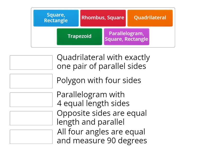 Parallelogram, Square, Rectangle - Opposite sides are equal length and parallel, Square, Rectangle - All four angles are equal and measure 90 degrees, Trapezoid - Quadrilateral with exactly one pair of parallel sides, Quadrilateral - Polygon with four sides, Rhombus, Square - Parallelogram with 4 equal length sides,