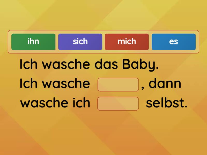 Ich wasche das Baby. Ich wasche ____, dann wasche ich ____ selbst. Du setzt deinen Sohn auf den Babystuhl. Zuerst setzt du ____ auf den Stuhl, danach setzt du ____ daneben. Sie kämmt ____ die Haare. Ihre Tochter kommt und sie kämmt ____ auch die Haare. Er stellt seine Frau vor. Zuerst stellt er ____ vor, danach stellt er ____ selbst vor. Das Mädchen meldet ____ an. Dann kommt seine Freundin und es meldet ____ auch an. Wir machen ein Selfie und fotografieren ____ alle. Danach machen wir noch ein Foto von den Kindern und fotografieren nur ____. Ihr zieht die Kinder an. Am besten zieht ihr ____ zuerst an und danach zieht ihr ____ selbst an.