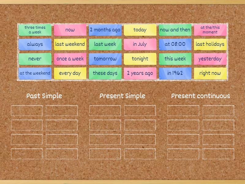 Past Simple: yesterday, last week, 2 years ago, in 1962, 2 months ago, last holidays, last weekend, in July, Present Simple: never, always, once a week, now and then, every day, at the weekend, three times a week, at 08:00, Present continuous: tomorrow, now, at the/this moment, these days, this week, right now, today, tonight,