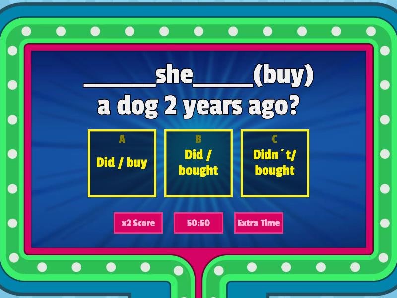 1) ______she_____(buy) a dog 2 years ago? a) Did / buy b) Did / bought c) Didn´t/ bought 2) Did she__________(work) yesterday? a) worked b) work c) didn´t work 3) ____________(go) to the party yesterday? a) Do you go b) Did you go c) Did you went 4) ____________(see) her grandma last weekend? a) Did she saw b) She did see c) Did she see 5) _____Hannah _______ (do) the homework last night? a) Did / did b) Did /  do c) Did / didn´t 6) ________Emma´s mum________ (cook) pancakes yesterday? a) Does/ cook b) Did/ cooked c) Did / cook 7) _________(play) games last week? a) Did we play b) We did play c) Did we played 8) ______________(decide) to go shopping? a) Did she decide b) Did decide she c) Did she decided 9) ___________(study) last year? a) You studied b) Did you study c) You did study 10) ____________(find) money last month? a) We did found b) Did we find c) We find 11) _____ she____________( come) to the party last night? a) Does/ come b) Didn't / come c) Did / come 12) ________they _______(travel) to Brazil last night? a) Do / travel b) Did / travel c) Did/ travelled 13) ___________________(have) a party at the weekend? a) Did my friends have b) My friends have c) Did my friends has 14) ________ (buy) a car a month ago ? a) You buy b) Did you bought c) Didi you buy d) When 15) _______you _____(go) to school by bus this morning? a) Do / went b) Did/ went c) Did/ go