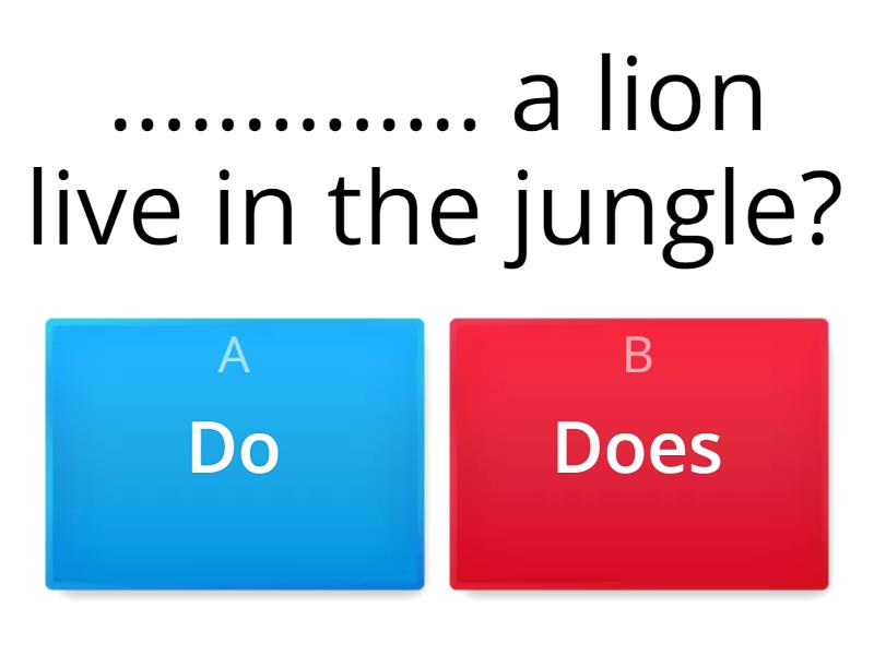 1) .............. a lion live in the jungle?  a) Do b) Does 2) .......... you like to listen to music? a) Do b) Does 3) .......... she play the piano on Sundays? a) Do b) Does 4) .......... they study English? a) Do b) Does 5) .......... he fix people´s teeth? a) Do b) Does 6) Do ............... visit the zoo in fall? a) they b) he 7) Does ............ watch TV in the afternoon? a) you b) she 8) Do ............. go to bed at 11 o´clock? a) I b) It