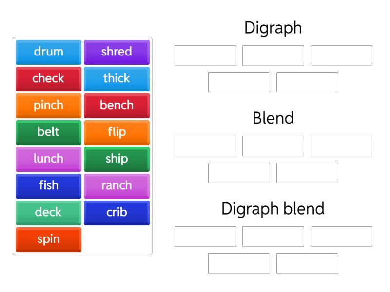 Digraph : check, deck, fish, ship, thick, Blend: spin, flip, drum, belt, crib, Digraph blend: lunch, shred, pinch, bench, ranch,