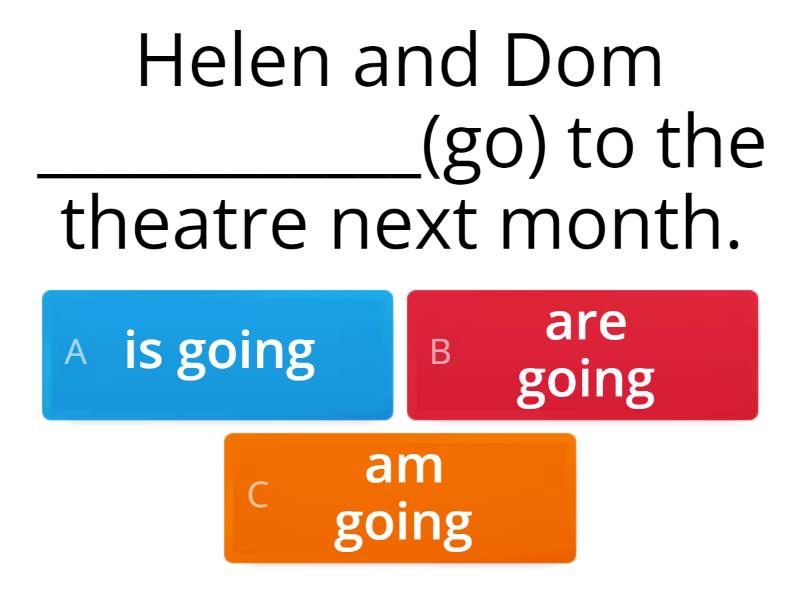 1) Helen and Dom ____________(go) to the theatre next month. a) is going b) are going c) am going 2) _____ Sam _________(play) The Sims tonight? a) Is/playing b) Are/playing c) Am/playing 3) Where ______ you________(spend) your next vacation? a) is/spending b) are/spending c) am/spending 4) I ______________(cook) dinner for my family tomorrow. a) am cooking b) are cooking c) is cooking 5) We __________(not/read) books this week. It's so boring... a) isn't reading b) are reading c) aren't reading 6) What _______ he_________(eat) for breakfast this morning? a) is/eatting b) is/eating c) are/eating 7) Vince and Jules ____________(not/bake) a cake for their mother this week. a) aren't bakeing b) isn't baking c) aren't baking 8) ______ their parents ________(write) e-mails tonight? a) Are/writing b) Is/writiing c) Are/writeing 9) Xavier __________(use) my tablet tomorrow. a) is useing b) is using c) are using 10) It ____________(sleep) in my bed. a) is sleeping b) is sleepping c) are sleeping
