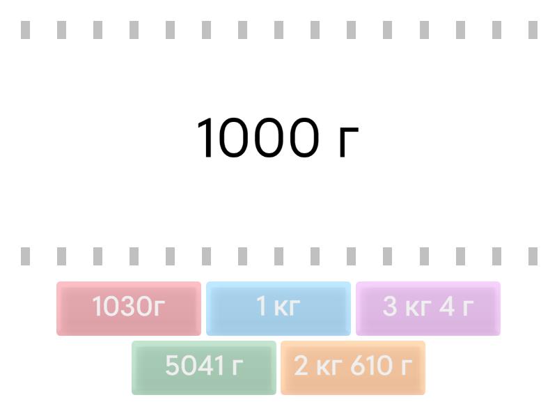 1 кг - 1000 г, 1030г - 1 кг 30 г, 2 кг 610 г - 2610 г, 5041 г - 5 кг 41 г, 3 кг 4 г - 3004 г,