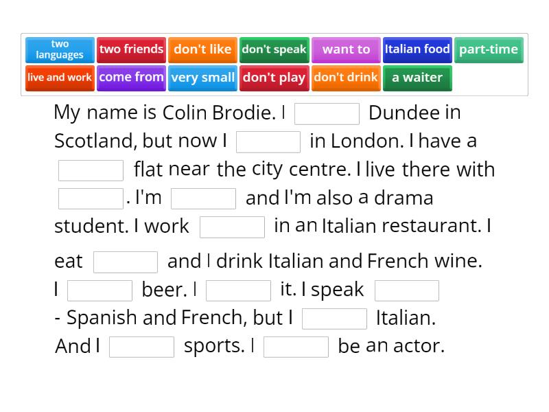 My name is Colin Brodie. I ____ Dundee in Scotland, but now I ____ in London. I have a ____ flat near the city centre. I live there with ____. I'm ____ and I'm also a drama student. I work ____ in an Italian restaurant. I eat ____ and I drink Italian and French wine. I ____ beer. I ____ it. I speak ____ - Spanish and French, but I ____ Italian. And I ____ sports. I ____ be an actor.