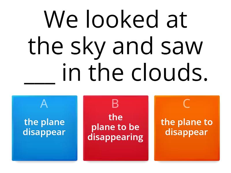 1) We looked at the sky and saw ___ in the clouds. a) the plane disappear b) the plane to be disappearing c) the plane to disappear 2) We expect the Chinese delegation ____ tomorrow. a) leaving b) to leaving c) to leave 3) Mr. Smith didn"t want his daughter ____ an actress. a) become b) to become c) becoming 4) We expected ____ in water polo championship. a) them to take part b) they to take part c) them take part 5) Mrs. Edwards usually ___ at home when he feels sick. a) let her son stay b) lets her son stay c) lets het son to stay 6) Betty felt ___ to tremble. a) her hands begin b) her hands to begin c) her hands to beginning 7) Linda is being very rude. I have never heard ___ to her mother like that before. a) that she talk b) her talk c) her to talk 8) I don"t want ___ your grandfather. It's very impolite of you. a) that you disturb b) you disturb c) you to disturb 9) The children are making too much noise. I"d like ___ quiet. a) they to be b) them to be c) that they be 10) The last drop makes ___. a) the cup run over b) the cup running over c) the cup to run over 11) I saw her ... into the building. (входила) a) to come b) coming c) come 12) Can I ... here? a) have my vacuum-cleaner repaired b) repair my vacuum-cleaner c) make my vacuum-cleaner repaired 13) I believed you ... three mobile phones. a) to have b) having c) have 14) He made me ... the window. a) to close b) closing c) close 15) I saw them ... in the park. a) to play b) playing c) play 16) She believes Mark ... a good guy. a) to be b) being c) be 17) I saw you ... in the park. Everybody liked it! a) to dance b) to dancing c) dancing 18) His mum wants him ... his homework. a) to do b) doing c) do 19) Shh! I hear someone ... . a) cry b) to cry c) crying 20) I ... before the wedding. a) cut my hair b) had my hair cut c) had cut my hair 21) He can’t make me ... this! a) to do b) doing c) do 22) I'd like him ... this task so well. a) to do b) do c) doing 23) His mum allowed him … home late tonight. a) to come b) coming c) come 24) Mr. Brown would like his son ... a surgeon. a) to become b) becoming c) become 25) I want my son ... more languages. a) to learn b) learning c) learn 26) Don’t let him ... you. a) to fool b) fooling c) fool 27) I expect the weather ... good today. a) to be b) being c) be 28) I heard her ... a famous English song. a) to sing b) singing c) sing 29) I know her ... a good student. a) to be b) being c) be 30) Rainy weather makes me ... bad. a) to feel b) feeling c) feel 31) Она вчера сама отремонтировала свои часы. a) She had her watch repaired yesterday. b) She repaired her watch yesterday. c) She was having her watch repaired yesterday.