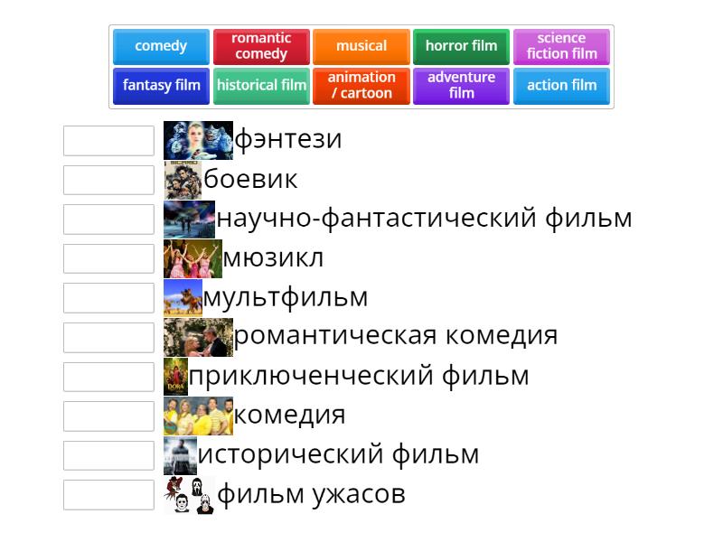 action film - боевик, adventure film - приключенческий фильм, animation / cartoon - мультфильм, comedy - комедия, fantasy film - фэнтези, historical film - исторический фильм, horror film - фильм ужасов, musical - мюзикл, romantic comedy - романтическая комедия, science fiction film - научно-фантастический фильм,