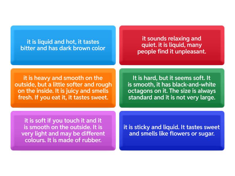 It is hard, but it seems soft. It is smooth, it has black-and-white octagons on it. The size is always standard and it is not very large., it is soft if you touch it and it is smooth on the outside. It is very light and may be different colours. It is made of rubber., it is liquid and hot, it tastes bitter and has dark brown color, it is heavy and smooth on the outside, but a little softer and rough on the inside. It is juicy and smells fresh. If you eat it, it tastes sweet., it is sticky and liquid. It tastes sweet and smells like flowers or sugar., it sounds relaxing and quiet. it is liquid, many people find it unpleasant.,
