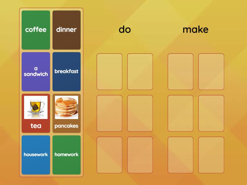 do: housework, homework, make: dinner, coffee, breakfast, a sandwich, tea, pancakes ,