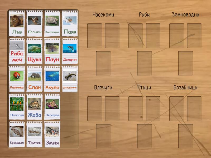 Насекоми: Калинка, Пеперуда, Паяк, Риби: Риба меч, Акула, Щука, Земноводни: Жаба, Дъждовник, Тритон, Влечуги: Костенурка, Змия, Крокодил, Птици: Пеликан, Папагал, Паун, Бозайници: Делфин, Слон, Лъв,