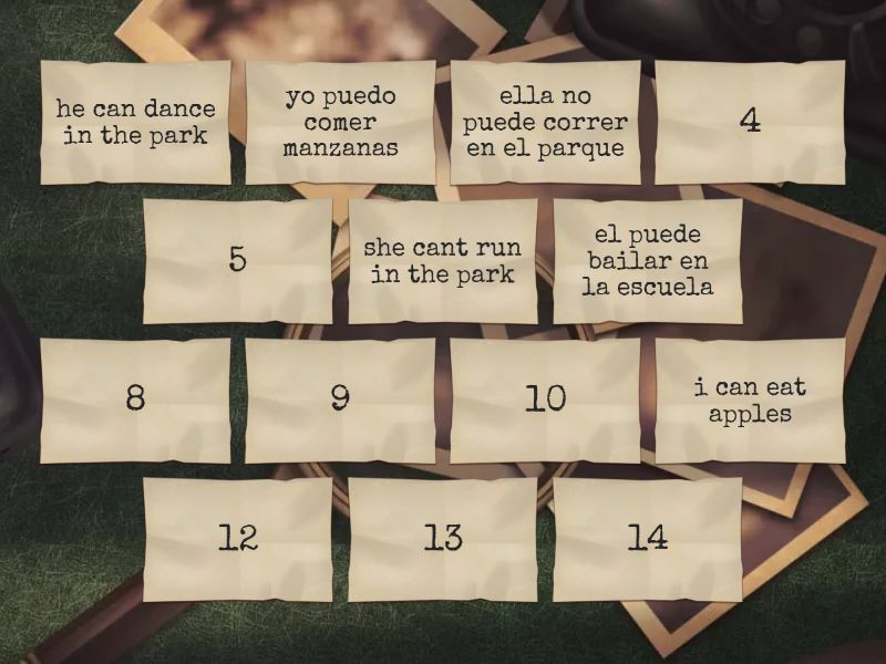 yo puedo comer manzanas - i can eat apples, ella no puede correr en el parque - she cant run in the park, el puede bailar en la escuela - he can dance in the park, nosotoros no podemos escuchar musica - we cant listen music, tu puedes leer antes de dormir - you can read before sleep, nosotros no podemos ver televesion - we cant watch tv, ella no puede patinar - she cant skate,