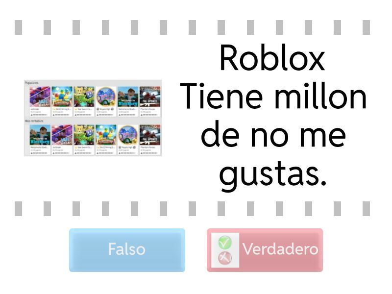 Falso: Roblox Tiene millon de no me gustas., Roblox es miserioso >:0, Roblox Es COn dinero O con DInero de robux ?', Verdadero: Roblox Tiene millon de megustas., Roblox Es mejor :D, En skywars se usa Auto click?,