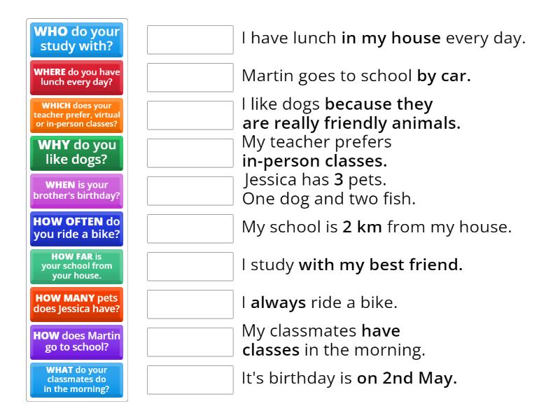 WHAT do your classmates do in the morning? - My classmates have classes in the morning., HOW OFTEN do you ride a bike? - I always ride a bike., WHERE do you have lunch every day? - I have lunch in my house every day., WHEN is your brother's birthday? - It's birthday is on 2nd May., WHY do you like dogs? - I like dogs because they are really friendly animals., WHO do your study with? - I study with my best friend., WHICH does your teacher prefer, virtual or in-person classes? - My teacher prefers in-person classes., HOW does Martin go to school? - Martin goes to school by car., HOW FAR is your school from your house. - My school is 2 km from my house., HOW MANY pets does Jessica have? - Jessica has 3 pets. One dog and two fish.,