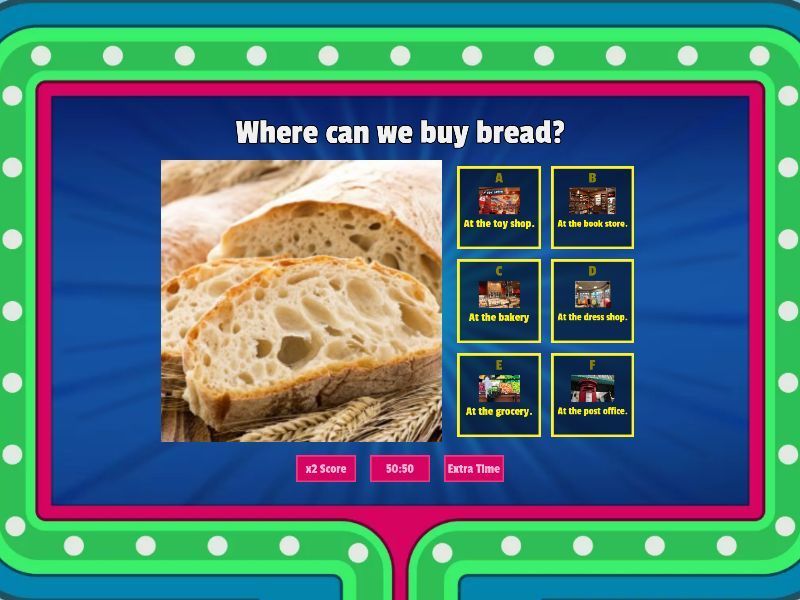 1) Where can we buy bread? a) At the toy shop. b) At the book store. c) At the bakery d) At the dress shop. e) At the grocery. f) At the post office. 2) Where can we buy vegetables? a) At the toy shop. b) At the book store. c) At the bakery d) At the dress shop. e) At the grocery. f) At the post office. 3) Where can we buy toys? a) At the toy shop. b) At the book store. c) At the bakery d) At the dress shop. e) At the grocery. f) At the post office. 4) Where can we buy clothes? a) At the toy shop. b) At the book store. c) At the bakery d) At the dress shop. e) At the grocery. f) At the post office. 5) Where can we buy stamps? a) At the toy shop. b) At the book store. c) At the bakery d) At the dress shop. e) At the grocery. f) At the post office. 6) Where can we buy notebooks? a) At the toy shop. b) At the book store. c) At the bakery d) At the dress shop. e) At the grocery. f) At the post office.