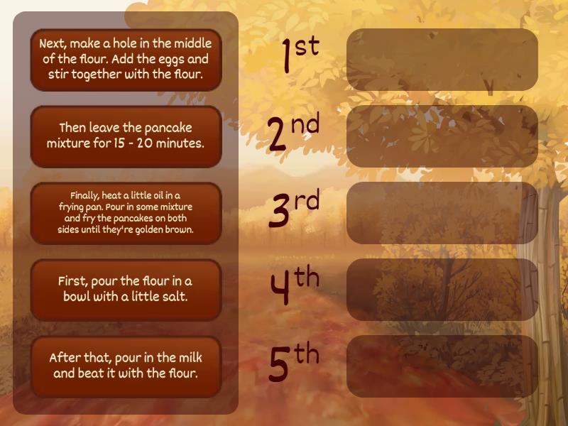 First, pour the flour in a bowl with a little salt., Next, make a hole in the middle of the flour. Add the eggs and stir together with the flour., After that, pour in the milk and beat it with the flour., Then leave the pancake mixture for 15 - 20 minutes., Finally, heat a little oil in a frying pan. Pour in some mixture and fry the pancakes on both sides until they're golden brown..