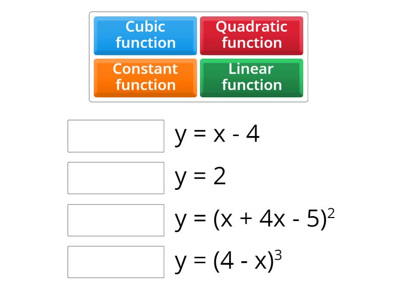 Quadratic function - y = (x + 4x - 5)2, Linear function - y = x - 4, Cubic function - y = (4 - x)3, Constant function - y = 2,
