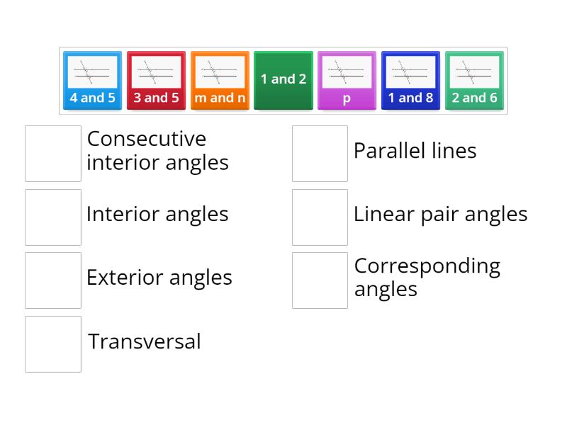 p - Transversal, m and n - Parallel lines, 2 and 6 - Corresponding angles, 1 and 8 - Exterior angles, 3 and 5 - Consecutive interior angles, 4 and 5 - Interior angles, 1 and 2 - Linear pair angles,