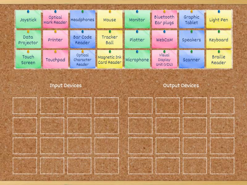 Input Devices: Microphone, Keyboard, Mouse, Joystick, Tracker Ball, Touch Screen, Light Pen, Scanner, Graphic Tablet, Bar Code Reader, Magnetic Ink Card Reader, Optical Character Reader, Optical Mark Reader, Braille Reader, Touchpad, WebCaM, Output Devices: Speakers, Printer, Monitor, Headphones, Data Projector, Plotter, Visual Display Unit (VDU), Bluetooth Ear plugs,