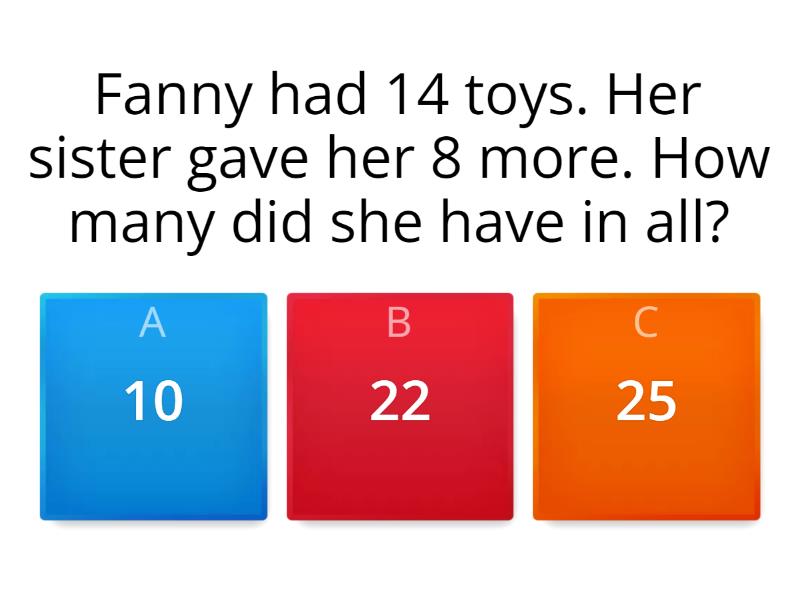 1) Fanny had 14 toys. Her sister gave her 8 more. How many did she have in all? a) 10 b) 22 c) 25 2) Amir had 7 cupcakes. Asaad gave him 3 more. How many cupcakes did Amir have altogether? a) 3 b) 15 c) 10 3) El had 13 fish. Mallory bought her 6 more. How many fish does El have in all? a) 19 b) 23 c) 42 4) Rayven gave Amia 3 candy bars and Kendyl gave Amia 6 more. How many candy bars does Rayven have in all? a) 1 b) 10 c) 9 5) Zion gave Gracie 4 pieces of gum. Gracie already had 14. How many did she have in all? a) 18 b) 3 c) 20 6) Antonio gave Azai 6 cups of flour.  Azai started with 5 cups. How much does he have in all? a) 76 b) 15 c) 11 7) There are 8 goldfish, mom adds 7 more to the fish tank. What is the sum of 7+8=? a) 13 b) 15 c) 4 8) I had 9 apples. I bought 7 more. How many do I have in all? a) 16 b) 2 c) 18 9) Jack has 12 pales of water. Jill has 5. What is the sum of 12 and 5? a) 16 b) 17 c) 500 10) Mom had 2 candles. My aunt bought her 19 more. How many candles are there in all? a) 24 b) 1 c) 21 11) I saw 9 bees then saw 7 more. How many bees did I see altogether? a) 16 b) 234 c) 18 12) My sister bought 14 balloons for my birthday party. Then dad bought 12 more. How many balloons did I have in all? a) 29 b) 26 c) 6 13) Natalie bought 17 books. Then bought 3 more. How many books did Natalie have in all? a) 765 b) 19 c) 20