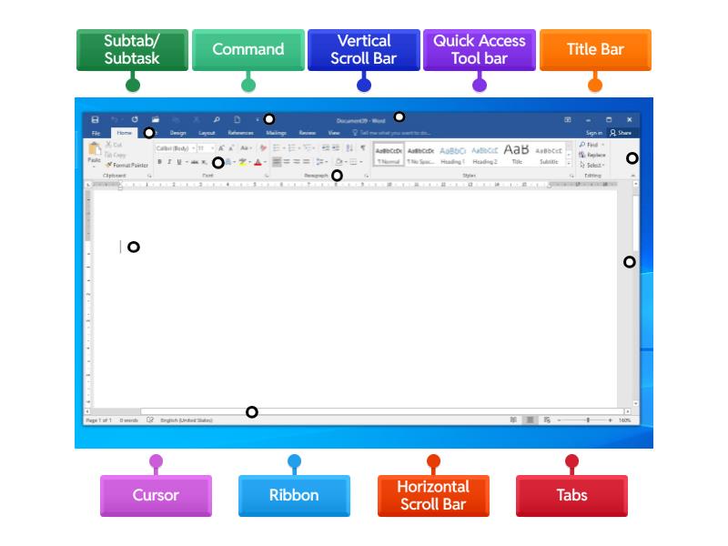 Ribbon, Tabs, Title Bar, Subtab/ Subtask, Cursor, Vertical Scroll Bar, Command, Horizontal Scroll Bar, Quick Access Tool bar.