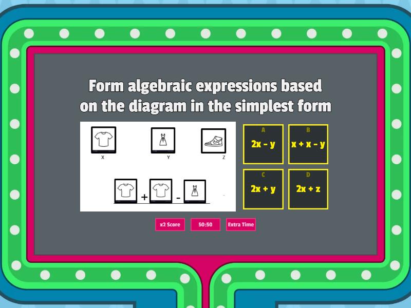 1) Form algebraic expressions based on the diagram in the simplest form  a) 2x - y b) x + x - y c) 2x + y d) 2x + z 2)  Form algebraic expressions based on the diagram in the simplest form a) 3X b) 3Y c) 3Z d) X + Z + Y 3)  Form algebraic expressions based on the diagram in the simplest form a) 10 Y + 10Z b) 10YZ c) 20YZ d) -10Y - 10Z 4)  Form algebraic expressions based on the diagram in the simplest form a) 5X b) c) d) 5 5) If value of X = 4 , Y = - 2 and Z = 5 ; evaluate  4X a) 16 b) 20 c) - 8 d) 8 6) If value of X = 4 , Y = - 2 and Z = 5 ; evaluate Y - 2Z a) 14 b) -14 c) - 12 d) 12 7) If value of X = 4 , Y = - 2 and Z = 5 ; evaluate  X - Y + Z a) 7 b) 11 c) -7 d) -11 8) If value of X = 4 , Y = - 2 and Z = 5 ; evaluate  4x + 3y – Z a) 9 b) -9 c) -5 d) 5 9) 5X + 4X = a) - 9x b) 9X c) 10x d) -10x 10) 20g – 4g = a) 16g b) 24g c) -16g d) -24g 11) 5(y) = a) y b) 5y c) 5 d) 5xy 12) 7( x - y ) = a) 7x - y b) 7xy c) 7x - 7y d) 14xy 13) 40v + 8 – 12v = a) 36V b) 28V c) 28V - 8 d) 28V + 8 14) 25 + 3d – 14d = a) 14d b) 25 - 11d c) 36d d) 25 +11d 15) 16m + 2g – 4m – 9g = a) 12m - 7g b) 19mg c) 12m + 7g d) 5mg 16) 15a + b – 2a + 8b = a) 4ab b) 22ab c) 13a + 9b d) 13a -9b 17) -12p + 5q + 8p - 8q = a) 7pq b) -7pq c) 4p + 3q d) - 4p - 3q 18) 5x + 6 – ( x + 10) = a) 4x - 16 b) 4x + 16 c) 4x - 4 d) 4x + 4 19) 5pq ( q + 4 )  a) 5pq2  + 20 pq b) 5p2q + 20  c) 5pq2 + 4 d) 25pq 20) - 7ry ( y - 4 ) + 3 a) -7ry2 - 4 ry + 3 b) -7ry2 + 28 ry + 3  c) 7ry2 - 28 ry + 3 d) -7ry2 + 28 ry