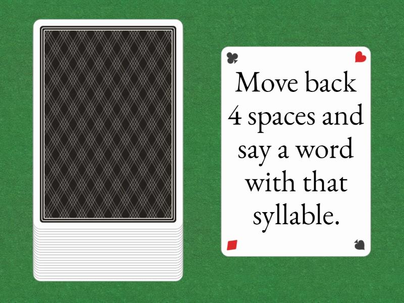 ankle, popsicle, Move back 4 spaces and say a word with that syllable., cuticle, Move back 3 spaces and say a word with that syllable. , Trade spots with another player. , Move back 3 spaces and say a word with that syllable., sprinkle, buckle, Move back 2 spaces and say a word with that syllable., Trade spots with another player. , twinkle, crinkle, sparkle, tackle, freckle, shackle, speckle, miracle, cubicle, grackle, trickle.