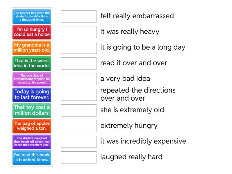 The students laughed their heads off when they heard their teachers joke.  - laughed really hard, That is the worst idea in the world. - a very bad idea, I'm so hungry I could eat a horse - extremely hungry, The teacher has given the students the directions a thousand times. - repeated the directions over and over, The bag of apples weighed a ton. - it was really heavy, That toy cost a million dollars - it was incredibly expensive, I've read this book a hundred times. - read it over and over, Today is going to last forever. - it is going to be a long day, My grandma is a million years old. - she is extremely old, The boy died of embarrassment when he messed up his speech. - felt really embarrassed,