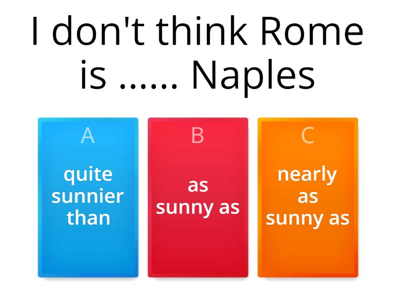 1) I don't think Rome is ...... Naples a) quite sunnier than b) as sunny as c) nearly as sunny as 2) My new smartphone is ... the old one a) much better then b) far better than c) considerably better than d) much more better than e) as better as 3) He is still ... businessman in the world a) easily the richest b) by far the richest c) far the richest d) a lot the richest 4) This car isn't ... as expensive as that one a) quite b) far c) nearly 5) It is usually ..... here than this summer a) a bit hotter b) a bit as hot c) as hot as d) slightly hot e) slightly hotter 6) The film is .... than the book a) as bad than b) slightly worser c) a bit worse d) a bit as bad as 7) We live ... from the sea than our friends a) more further b) much more further c) much further d) a lot more further e) far further f) by far further 8) Watching films in English is .... than in my own language a) slightly difficult b) more difficult c) a bit more difficult d) much difficult e) far more difficult