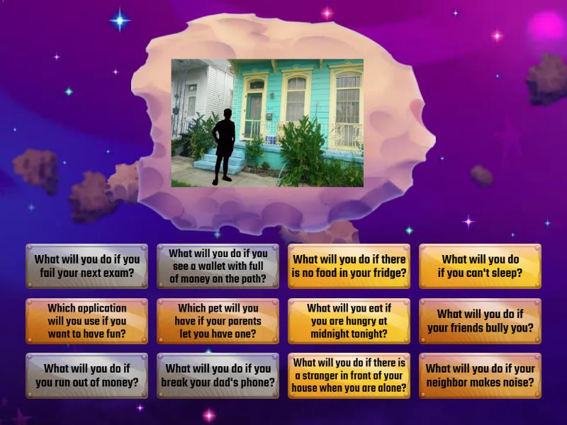 What will you do if there is a stranger in front of your house when you are alone?, What will you do if you break your dad's phone?, What will you do if your friends bully you?, What will you do if you can't sleep?, What will you do if you fail your next exam?, Which pet will you have if your parents let you have one?, What will you eat if you are hungry at midnight tonight?, What will you do if you run out of money?, What will you do if your neighbor makes noise?, What will you do if there is no food in your fridge?, What will you do if you see a wallet with full of money on the path?, Which application will you use if you want to have fun?,