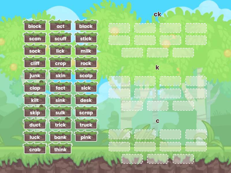 ck: sock, block, truck, luck, sick, stick, lick, trick, rock, black, k: pink, sink, junk, desk, bank, think, milk, sulk, skin, skip, kilt, c: clap, scuff, crop, crab, scrap, cliff, fact, act, duct, scan, scalp,