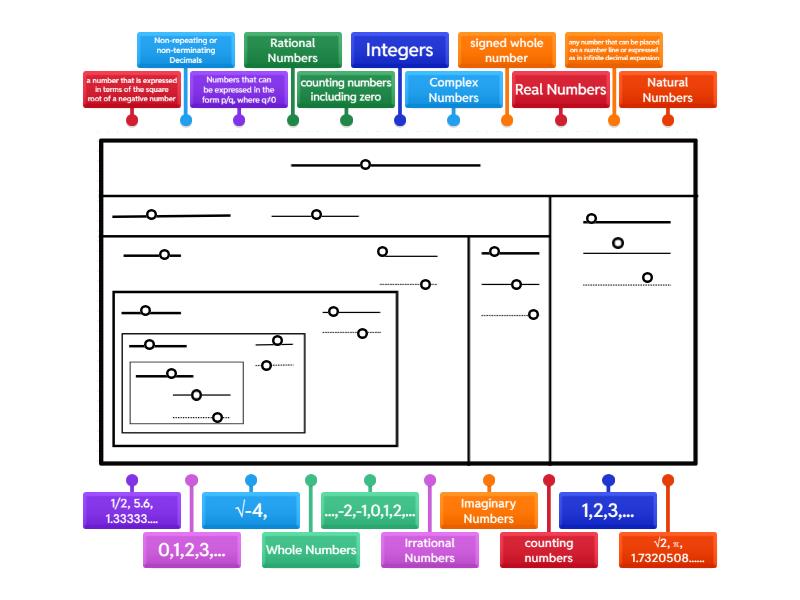 Complex Numbers, Real Numbers, Imaginary Numbers, Rational Numbers, Irrational Numbers, Integers, Whole Numbers, Natural Numbers, Numbers that can be expressed in the form p/q, where q≠0, Non-repeating or non-terminating Decimals, counting numbers, signed whole number , counting numbers including zero, 0,1,2,3,..., 1,2,3,..., ...,-2,-1,0,1,2,..., √2, ℼ, 1.7320508......, 1/2, 5.6, 1.33333...., √-4, , a number that is expressed in terms of the square root of a negative number, any number that can be placed on a number line or expressed as in infinite decimal expansion.