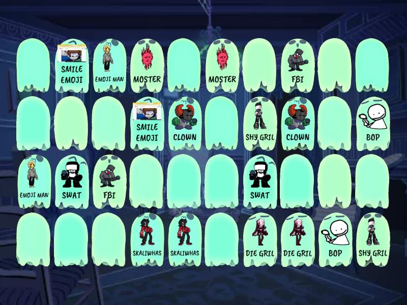 FBI, EMOJI MAN, BOP, SMILE EMOJI, SHY GRIL, SKALIWHAS, DIE GRIL, SWAT, MOSTER, CLOWN, TRAIN MAN, BOTTLE GRIL, WEREWOLF, SIMP, RBO MAN, BREAK UR LEG TIME, 中家老师, PUMKIN N SKELETON, UR MOM, LIVING BOOM,
