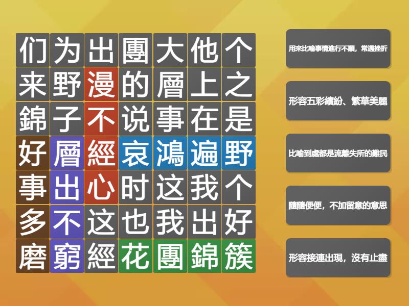 花團錦簇 - 形容五彩繽紛、繁華美麗, 層出不窮 - 形容接連出現,沒有止盡, 漫不經心 - 隨隨便便,不加留意的意思, 哀鴻遍野 - 比喻到處都是流離失所的難民, 好事多磨 - 用來比喻事情進行不順,常遇挫折,