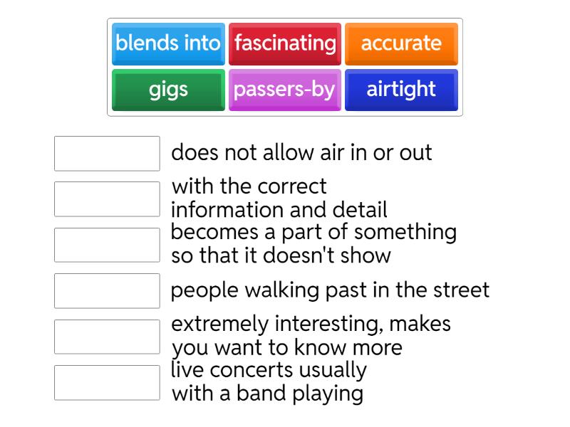 fascinating - extremely interesting, makes you want to know more, blends into - becomes a part of something so that it doesn't show, passers-by - people walking past in the street, airtight - does not allow air in or out, gigs - live concerts usually with a band playing, accurate - with the correct information and detail,
