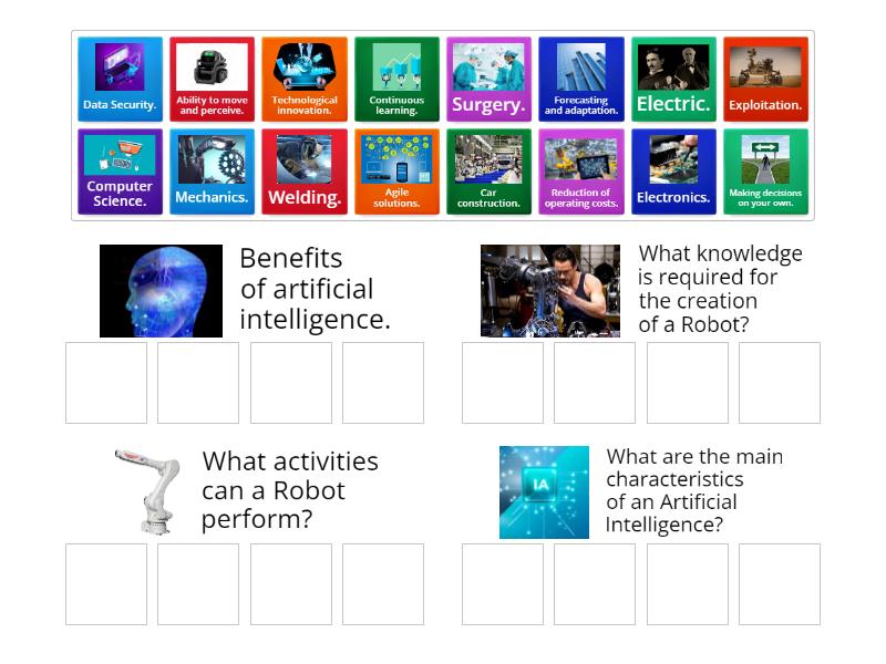 Benefits of artificial intelligence.: Reduction of operating costs., Technological innovation., Agile solutions., Data Security., What knowledge is required for the creation of a Robot?: Mechanics., Electronics., Computer Science., Electric., What activities can a Robot perform?: Car construction., Welding., Exploitation., Surgery., What are the main characteristics of an Artificial Intelligence?: Forecasting and adaptation., Making decisions on your own., Continuous learning., Ability to move and perceive.,
