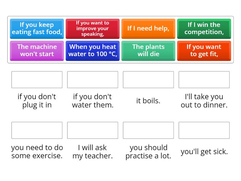 If I win the competition, - I'll take you out to dinner., If I need help, - I will ask my teacher., If you keep eating fast food, - you'll get sick., The machine won't start - if you don't plug it in, The plants will die - if you don't water them., If you want to get fit, - you need to do some exercise., When you heat water to 100 °C, - it boils., If you want to improve your speaking, - you should practise a lot.,