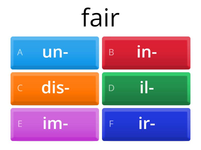 1) fair a) un- b) in- c) dis- d) il- e) im- f) ir- 2) patient a) un- b) in- c) dis- d) il- e) im- f) ir- 3) correct a) un- b) in- c) dis- d) il- e) im- f) ir- 4) dependent a) un- b) in- c) dis- d) il- e) im- f) ir- 5) honest a) un- b) in- c) dis- d) il- e) im- f) ir- 6) visible a) un- b) in- c) dis- d) il- e) im- f) ir- 7) legible a) un- b) in- c) dis- d) il- e) im- f) ir- 8) polite a) un- b) in- c) dis- d) il- e) im- f) ir- 9) kind a) un- b) in- c) dis- d) il- e) im- f) ir- 10) regular a) un- b) in- c) dis- d) il- e) im- f) ir- 11) likely a) un- b) in- c) dis- d) il- e) im- f) ir- 12) safe a) un- b) in- c) dis- d) il- e) im- f) ir- 13) surprising a) un- b) in- c) dis- d) il- e) im- f) ir- 14) possible a) un- b) in- c) dis- d) il- e) im- f) ir- 15) responsible a) un- b) in- c) dis- d) il- e) im- f) ir- 16) loyal a) un- b) in- c) dis- d) il- e) im- f) ir- 17) legal a) un- b) in- c) dis- d) il- e) im- f) ir- 18) certain a) un- b) in- c) dis- d) il- e) im- f) ir- 19) believable a) un- b) in- c) dis- d) il- e) im- f) ir- 20) tidy a) un- b) in- c) dis- d) il- e) im- f) ir- 21) satisfied a) un- b) in- c) dis- d) il- e) im- f) ir- 22) acceptable a) un- b) in- c) dis- d) il- e) im- f) ir-