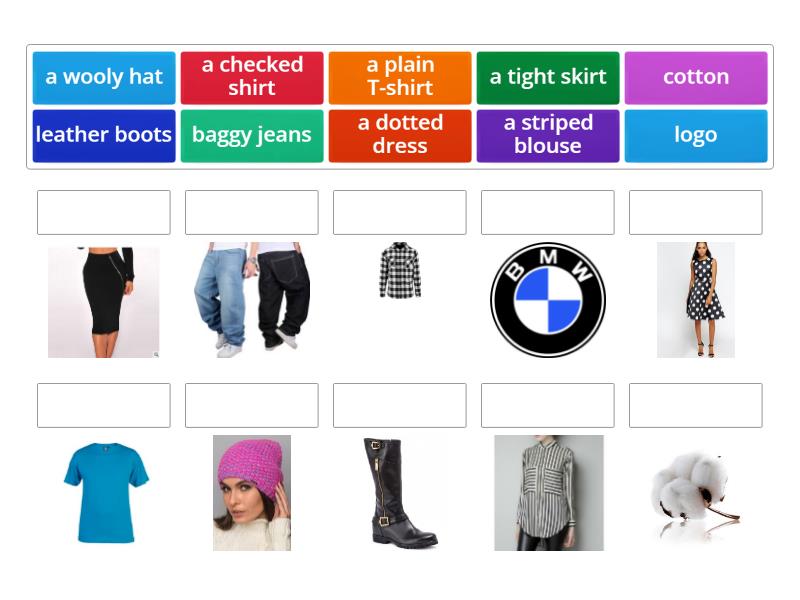 baggy jeans, a tight skirt, leather boots, a wooly hat, a plain T-shirt, a checked shirt - , a striped blouse, cotton, logo, a dotted dress,