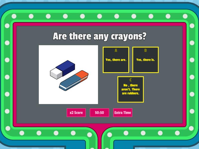 1) Are there any felt tips ? a) Yes, there are. b) No, No there aren't. c) Yes, there is. 2) Are there any notebooks ? a) No, there isn't. b) No , there aren't. c) Yes, there are. 3) Are there any rubbers? a) No, there aren't. There are scissors. b) Yes, there is. c) Yes, there are. 4) Are there any paintbrushes ? a) Yes, there is. b) Yes, there are. c) No there aren't 5) Are there any crayons? a) Yes, there are. b) Yes, there is. c) No , there aren't. There are rubbers.
