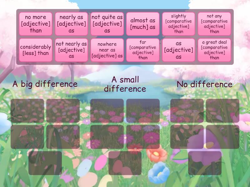 A big difference: far [comparative adjective] than, nowhere near as [adjective] as, considerably [less] than, not nearly as [adjective] as, a great deal [comparative adjective] than, A small difference: almost as [much] as , nearly as [adjective] as , slightly [comparative adjective] than, not quite as [adjective] as, No difference: as [adjective] as, not any [comparative adjective] than, no more [adjective] than,