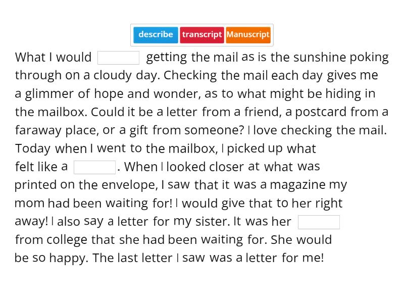What I would ____ getting the mail as is the sunshine poking through on a cloudy day. Checking the mail each day gives me a glimmer of hope and wonder, as to what might be hiding in the mailbox. Could it be a letter from a friend, a postcard from a faraway place, or a gift from someone? I love checking the mail. Today when I went to the mailbox, I picked up what felt like a ____. When I looked closer at what was printed on the envelope, I saw that it was a magazine my mom had been waiting for! I would give that to her right away! I also say a letter for my sister. It was her ____ from college that she had been waiting for. She would be so happy. The last letter I saw was a letter for me! When I got inside, I gave my mom her magazine ____ and my sister her transcript. Then, I quickly opened the letter addressed to me! In my hands, I held a letter from my pen pal. The letter was written neatly with a ____ design around the edges. My pen pal was from England and she went on and on. She told me that her mom was sick, but was ____ medicine and was feeling better. She said told me about all the things to do in England. Then, at the very bottom of the letter, I saw it. The ____ It said, “P.S.- Come to England and visit me!” I couldn't believe it. My first invite to England! That surprise invitation was something I couldn’t believe. Now all I had to do was to convince my parents why it was time for us to take a trip to England!!