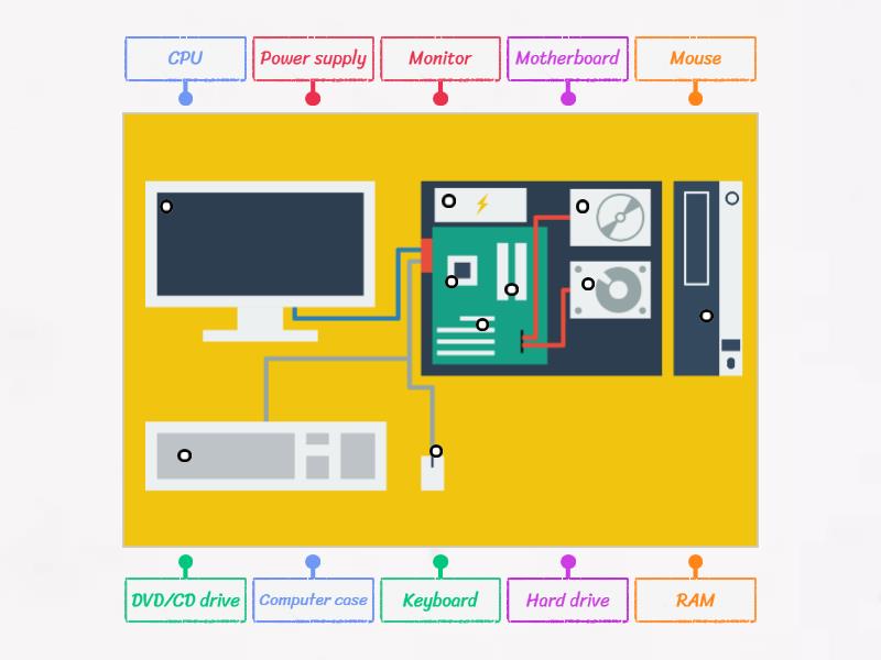 Monitor, Keyboard, Mouse, Motherboard, CPU, Power supply, DVD/CD drive, RAM, Hard drive, Computer case.